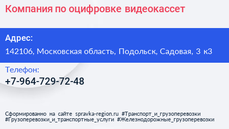 Компания по оцифровке видеокассет по адресу 142106, Московская область, Подольск, Садовая, 3 к3 в дальнейшем Организация, размещена в следующих категориях: