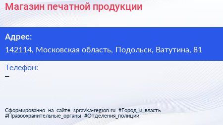 Магазин печатной продукции по адресу 142114, Московская область, Подольск, Ватутина, 81 в дальнейшем Организация, размещена в следующих категориях: