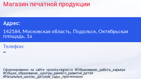 Магазин печатной продукции по адресу 142184, Московская область, Подольск, Октябрьская площадь, 1а в дальнейшем Организация, размещена в следующих категориях: