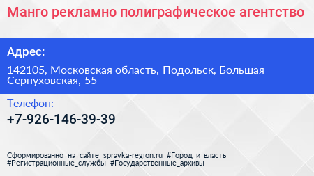 Манго, рекламно-полиграфическое агентство по адресу 142105, Московская область, Подольск, Большая Серпуховская, 55 в дальнейшем Организация, размещена в следующих категориях: