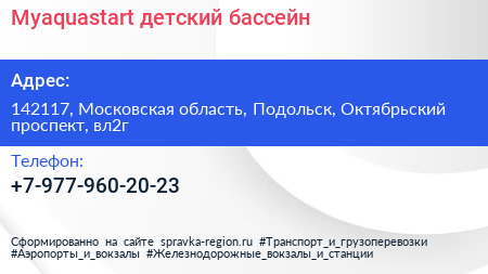 Myaquastart, детский бассейн по адресу 142117, Московская область, Подольск, Октябрьский проспект, вл2г в дальнейшем Организация, размещена в следующих категориях: