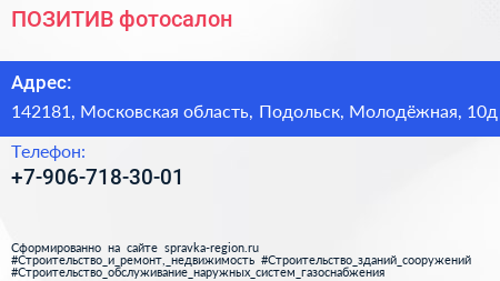 ПОЗИТИВ, фотосалон по адресу 142181, Московская область, Подольск, Молодёжная, 10д в дальнейшем Организация, размещена в следующих категориях: