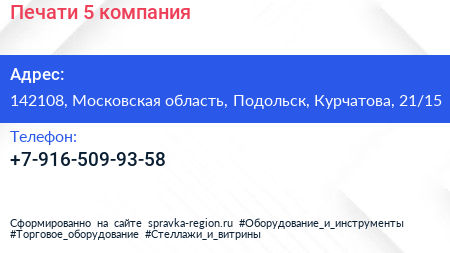Печати 5, компания по адресу 142108, Московская область, Подольск, Курчатова, 21/15 в дальнейшем Организация, размещена в следующих категориях: