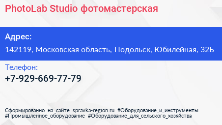 PhotoLab Studio, фотомастерская по адресу 142119, Московская область, Подольск, Юбилейная, 32Б в дальнейшем Организация, размещена в следующих категориях: