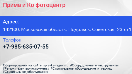 Прима и Ко, фотоцентр по адресу 142100, Московская область, Подольск, Советская, 23 ст1 в дальнейшем Организация, размещена в следующих категориях: