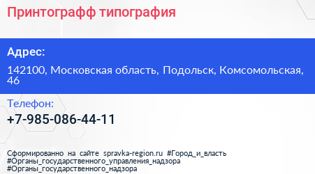 Принтографф, типография по адресу 142100, Московская область, Подольск, Комсомольская, 46 в дальнейшем Организация, размещена в следующих категориях: