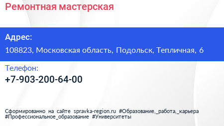 Ремонтная мастерская по адресу 108823, Московская область, Подольск, Тепличная, 6 в дальнейшем Организация, размещена в следующих категориях: