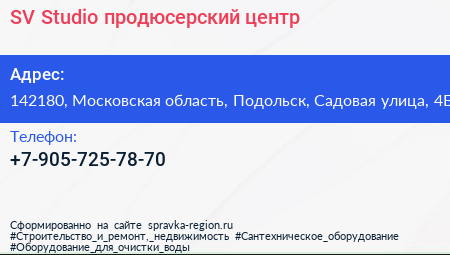 SV Studio, продюсерский центр по адресу 142180, Московская область, Подольск, Садовая улица, 4Б в дальнейшем Организация, размещена в следующих категориях: