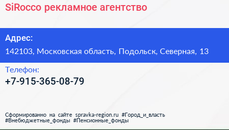 SiRocco, рекламное агентство по адресу 142103, Московская область, Подольск, Северная, 13 в дальнейшем Организация, размещена в следующих категориях: