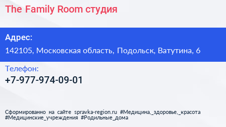 The Family Room, студия по адресу 142105, Московская область, Подольск, Ватутина, 6 в дальнейшем Организация, размещена в следующих категориях: