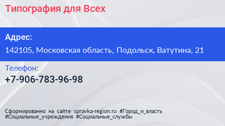 Типография для Всех по адресу 142105, Московская область, Подольск, Ватутина, 21 в дальнейшем Организация, размещена в следующих категориях: