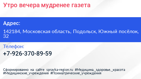 Утро вечера мудренее, газета по адресу 142184, Московская область, Подольск, Южный посёлок, 32 в дальнейшем Организация, размещена в следующих категориях: