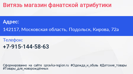 Витязь, магазин фанатской атрибутики по адресу 142117, Московская область, Подольск, Кирова, 72а в дальнейшем Организация, размещена в следующих категориях: