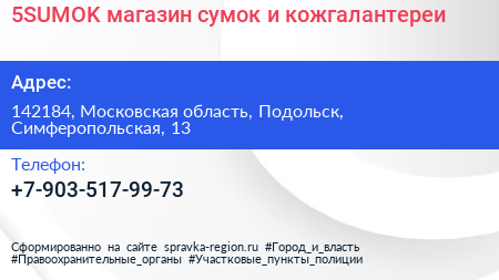 5SUMOK, магазин сумок и кожгалантереи по адресу 142184, Московская область, Подольск, Симферопольская, 13 в дальнейшем Организация, размещена в следующих категориях: