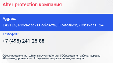 Alter-protection, компания по адресу 142116, Московская область, Подольск, Лобачева, 14 в дальнейшем Организация, размещена в следующих категориях:
