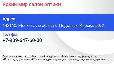 Яркий мир, салон оптики по адресу 142110, Московская область, Подольск, Кирова, 50/2 в дальнейшем Организация, размещена в следующих категориях: