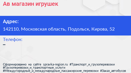 Ав, магазин игрушек по адресу 142110, Московская область, Подольск, Кирова, 52 в дальнейшем Организация, размещена в следующих категориях: