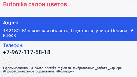 Butonika, салон цветов по адресу 142180, Московская область, Подольск, улица Ленина, 9 киоск в дальнейшем Организация, размещена в следующих категориях: