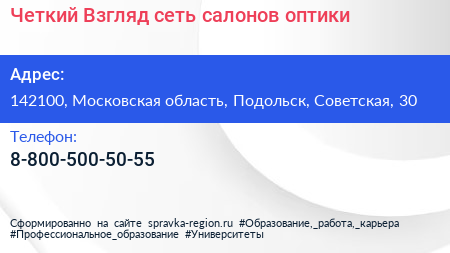 Четкий Взгляд, сеть салонов оптики по адресу 142100, Московская область, Подольск, Советская, 30 в дальнейшем Организация, размещена в следующих категориях: