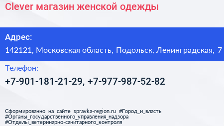 Clever, магазин женской одежды по адресу 142121, Московская область, Подольск, Ленинградская, 7 в дальнейшем Организация, размещена в следующих категориях: