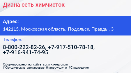 Диана, сеть химчисток по адресу 142115, Московская область, Подольск, Правды, 3 в дальнейшем Организация, размещена в следующих категориях: