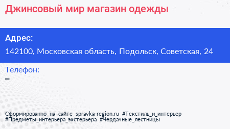 Джинсовый мир, магазин одежды по адресу 142100, Московская область, Подольск, Советская, 24 в дальнейшем Организация, размещена в следующих категориях: