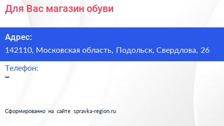 Для Вас, магазин обуви по адресу 142110, Московская область, Подольск, Свердлова, 26 в дальнейшем Организация, размещена в следующих категориях: