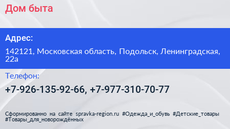 Дом быта по адресу 142121, Московская область, Подольск, Ленинградская, 22а в дальнейшем Организация, размещена в следующих категориях: