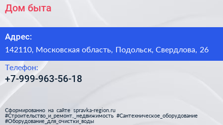 Дом быта по адресу 142110, Московская область, Подольск, Свердлова, 26 в дальнейшем Организация, размещена в следующих категориях: