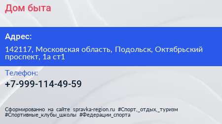 Дом быта по адресу 142117, Московская область, Подольск, Октябрьский проспект, 1а ст1 в дальнейшем Организация, размещена в следующих категориях: