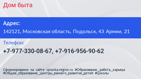 Дом быта по адресу 142121, Московская область, Подольск, 43 Армии, 21 в дальнейшем Организация, размещена в следующих категориях: