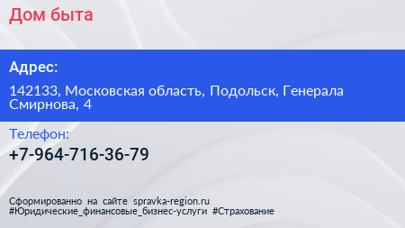 Дом быта по адресу 142133, Московская область, Подольск, Генерала Смирнова, 4 в дальнейшем Организация, размещена в следующих категориях: