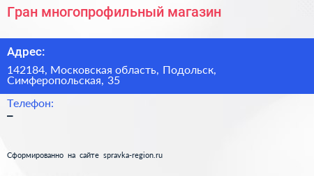 Гран, многопрофильный магазин по адресу 142184, Московская область, Подольск, Симферопольская, 35 в дальнейшем Организация, размещена в следующих категориях: