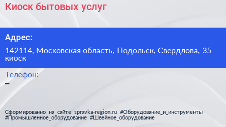 Киоск бытовых услуг по адресу 142114, Московская область, Подольск, Свердлова, 35 киоск в дальнейшем Организация, размещена в следующих категориях: