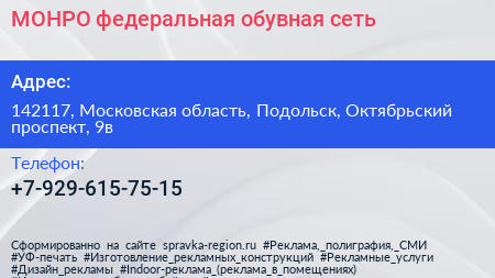 МОНРО, федеральная обувная сеть по адресу 142117, Московская область, Подольск, Октябрьский проспект, 9в в дальнейшем Организация, размещена в следующих категориях: