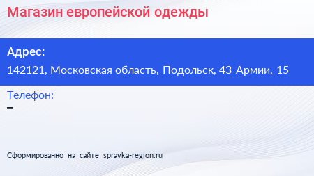 Магазин европейской одежды по адресу 142121, Московская область, Подольск, 43 Армии, 15 в дальнейшем Организация, размещена в следующих категориях: