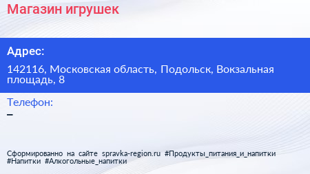 Магазин игрушек по адресу 142116, Московская область, Подольск, Вокзальная площадь, 8 в дальнейшем Организация, размещена в следующих категориях: