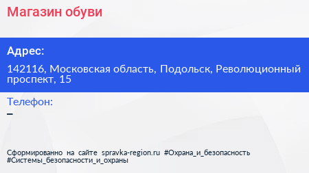Магазин обуви по адресу 142116, Московская область, Подольск, Революционный проспект, 15 в дальнейшем Организация, размещена в следующих категориях:
