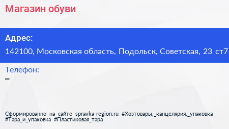 Магазин обуви по адресу 142100, Московская область, Подольск, Советская, 23 ст7 в дальнейшем Организация, размещена в следующих категориях: