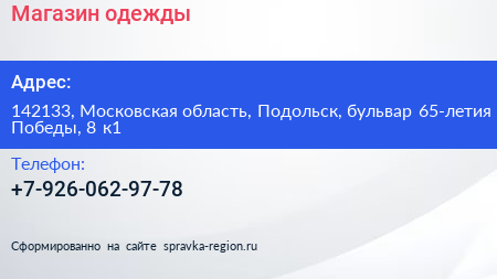 Магазин одежды по адресу 142133, Московская область, Подольск, бульвар 65-летия Победы, 8 к1 в дальнейшем Организация, размещена в следующих категориях: