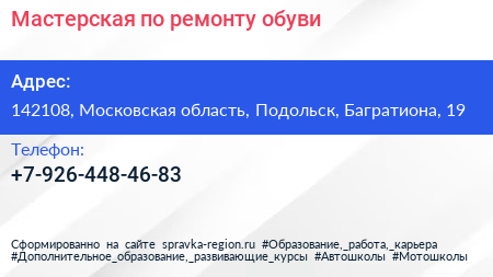 Мастерская по ремонту обуви по адресу 142108, Московская область, Подольск, Багратиона, 19 в дальнейшем Организация, размещена в следующих категориях: