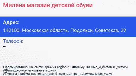 Милена, магазин детской обуви по адресу 142100, Московская область, Подольск, Советская, 29 в дальнейшем Организация, размещена в следующих категориях: