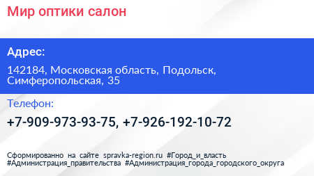 Мир оптики, салон по адресу 142184, Московская область, Подольск, Симферопольская, 35 в дальнейшем Организация, размещена в следующих категориях: