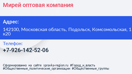 Мирей, оптовая компания по адресу 142100, Московская область, Подольск, Комсомольская, 1 к20 в дальнейшем Организация, размещена в следующих категориях: