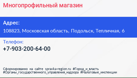 Многопрофильный магазин по адресу 108823, Московская область, Подольск, Тепличная, 6 в дальнейшем Организация, размещена в следующих категориях: