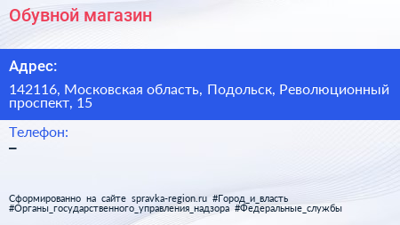 Обувной магазин по адресу 142116, Московская область, Подольск, Революционный проспект, 15 в дальнейшем Организация, размещена в следующих категориях: