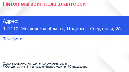 Питон, магазин кожгалантереи по адресу 142110, Московская область, Подольск, Свердлова, 26 в дальнейшем Организация, размещена в следующих категориях: