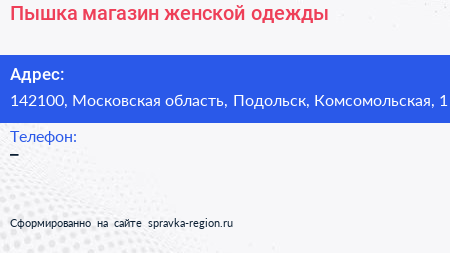 Пышка, магазин женской одежды по адресу 142100, Московская область, Подольск, Комсомольская, 1 в дальнейшем Организация, размещена в следующих категориях: