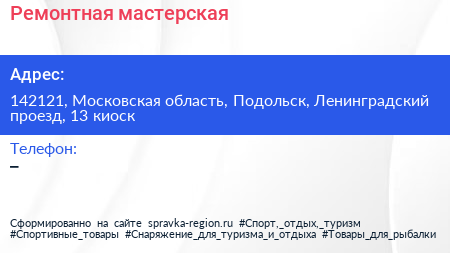 Ремонтная мастерская по адресу 142121, Московская область, Подольск, Ленинградский проезд, 13 киоск в дальнейшем Организация, размещена в следующих категориях:
