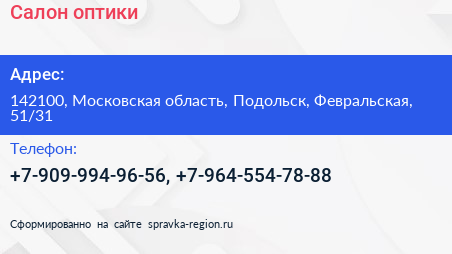 Салон оптики по адресу 142100, Московская область, Подольск, Февральская, 51/31 в дальнейшем Организация, размещена в следующих категориях: